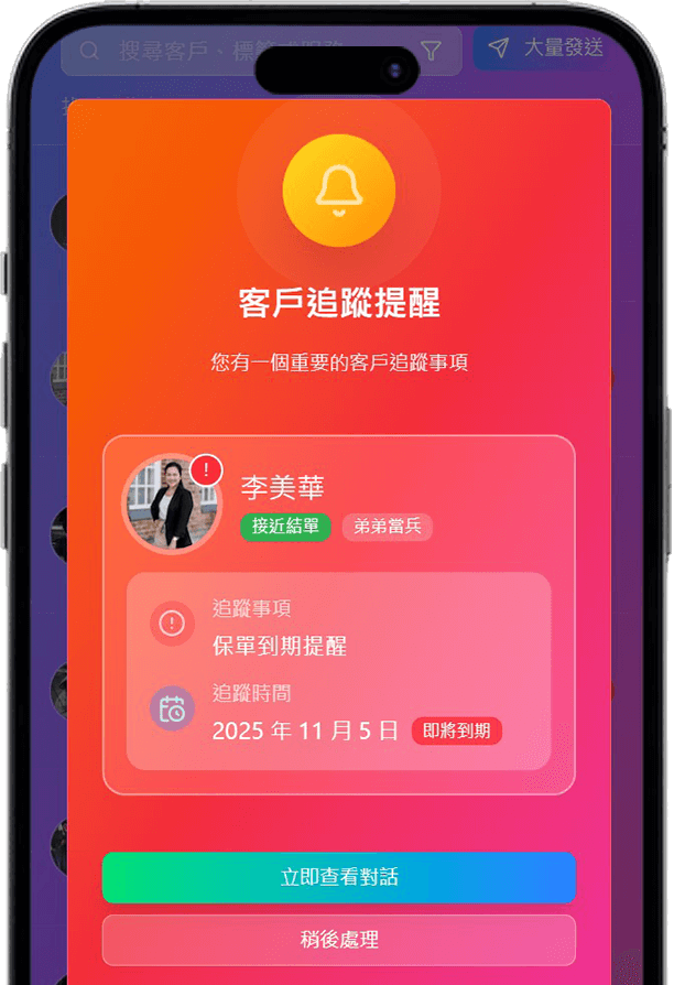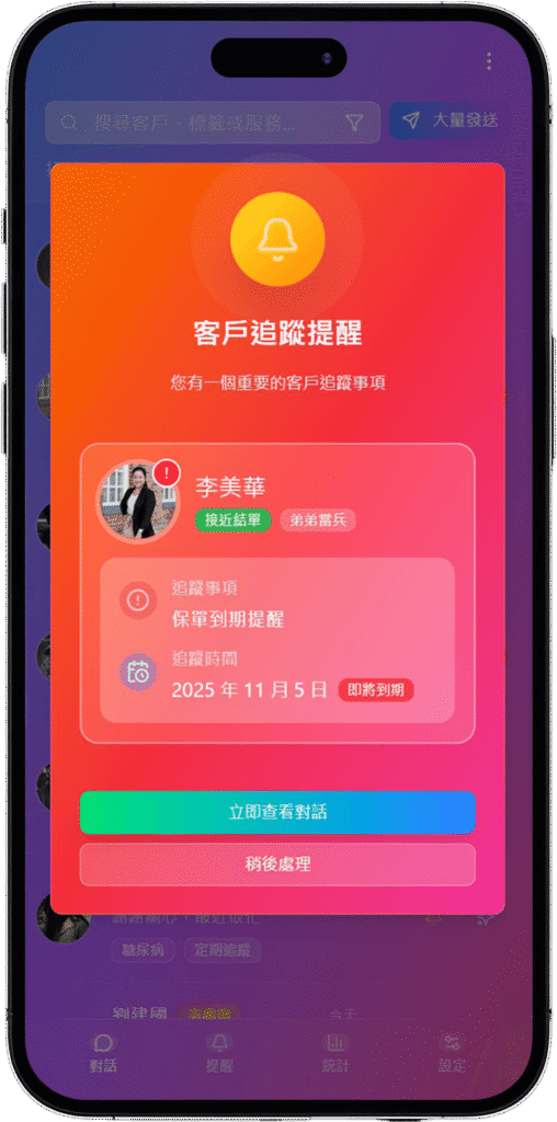 - 一進 App 的跳出提醒畫面,重要客戶不會被 LINE 對話洪流淹沒。