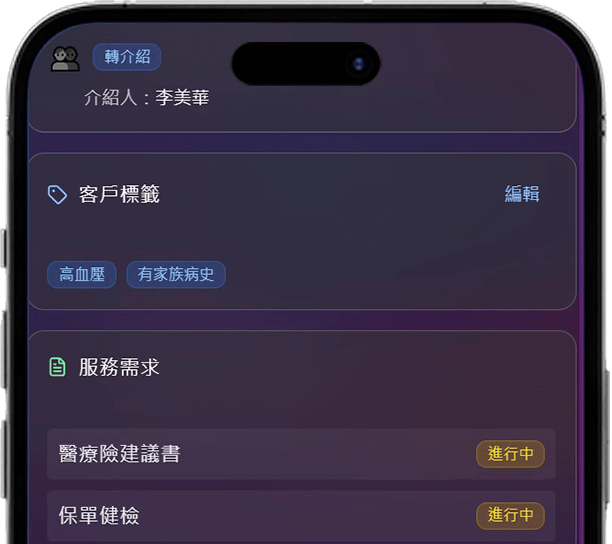 對話後自動產生摘要,寫進客戶檔案,包含標籤(如高血壓)、客戶來源(如扶輪社)與待辦服務(保單健檢)。