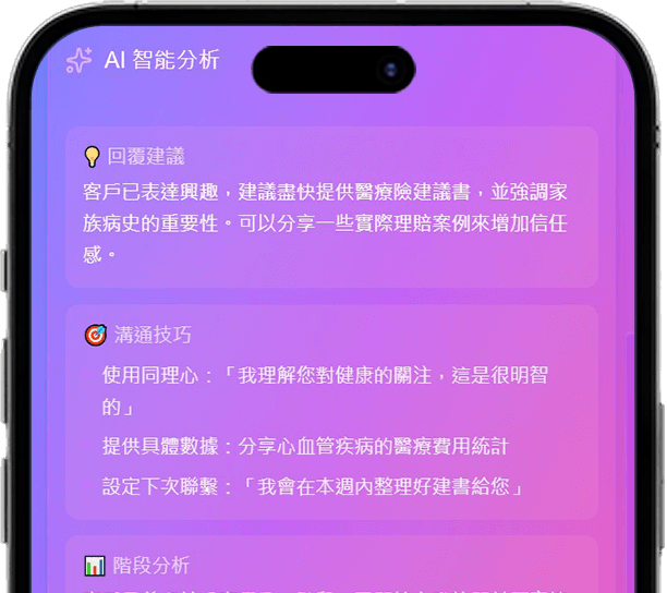 自動分析對話、標記階段、建議跟進節奏。讓每一次跟進都有跡可循。