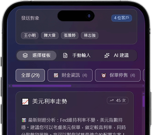 不管是對客戶的溝通內容或是對自己的增員夥伴的訓練都可以做成對話樣板,分群管理,大量發送。