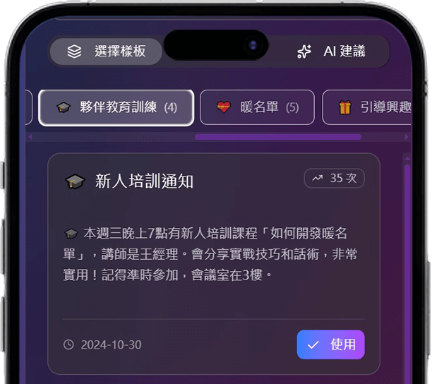 整合多位銷售大師的業務精華,AI智慧在適當的時候給您客戶溝通的建議,讓你減少學習時間,直接使用銷售大師的溝通智慧。